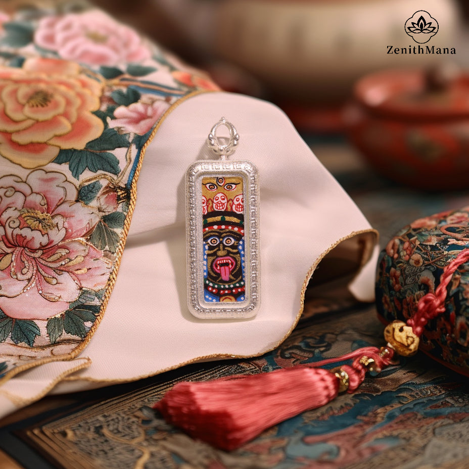 Hand-Painted Tibetan Zhakiram Silver Rectangular Thangka Pendant Amulet