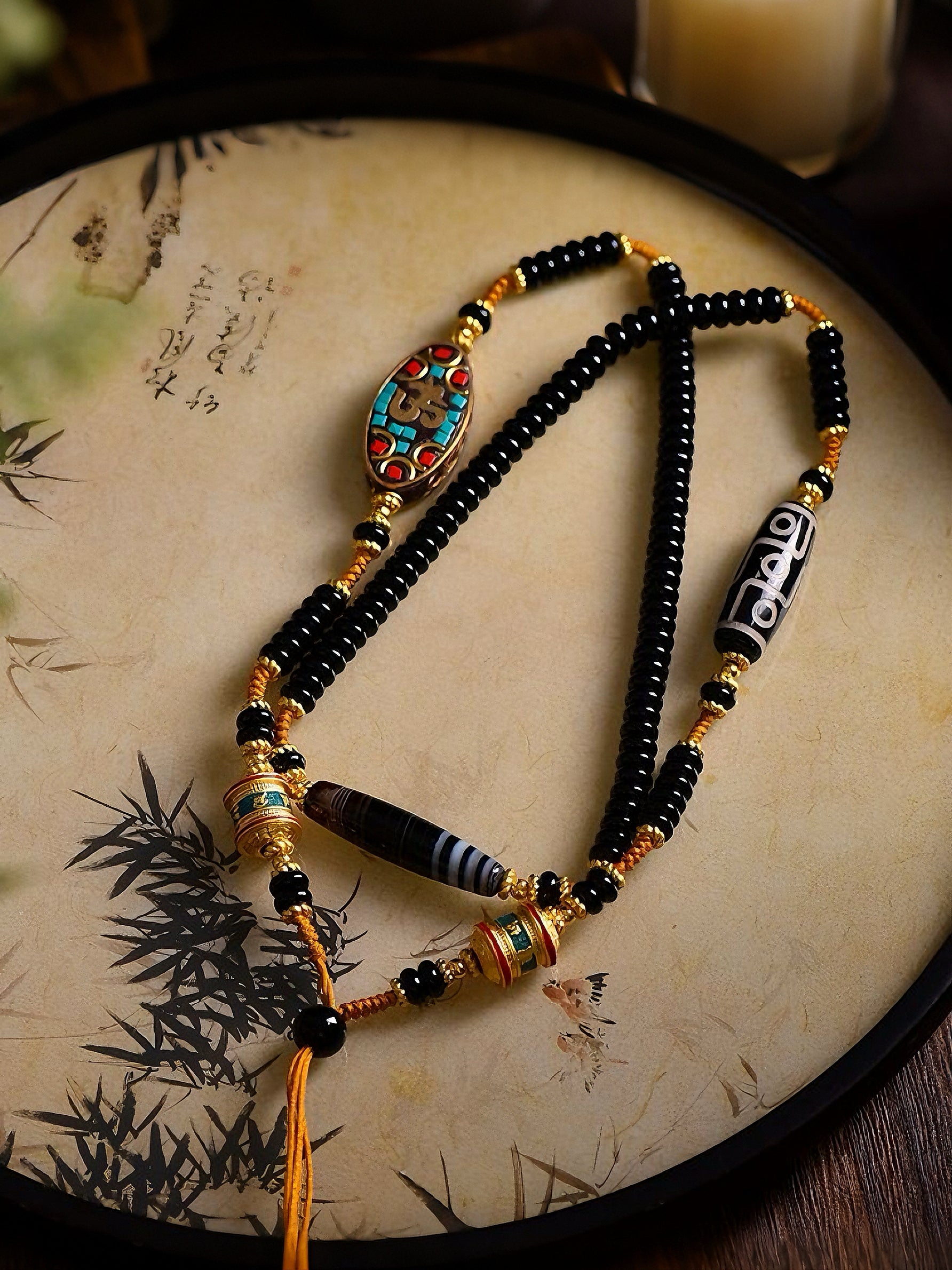 Agate & Dzi Bead Tibetan Necklace – Versatile Pendant Hanging Rope