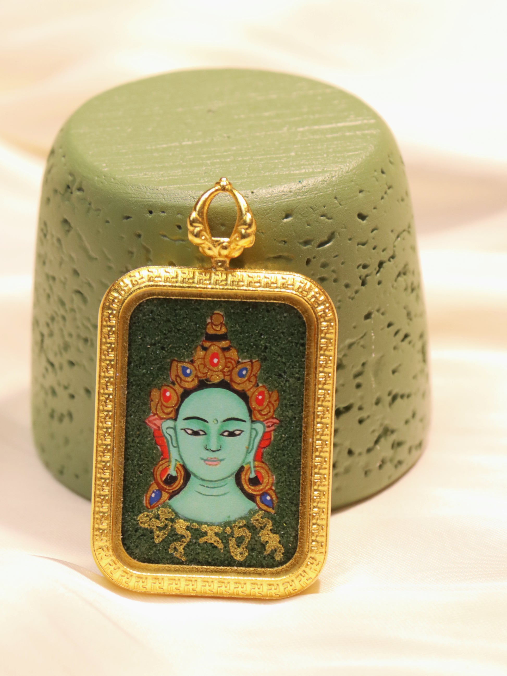 Every Thangka is hand-painted over weeks or months using time-honored methods. The process is entirely manual — no machines, no printing, only patience and prayer. To care for your Thangka pendant, keep it away from moisture and direct sunlight, and gently wipe it with a dry cloth. You may also place it in a calm space or near incense to preserve its sacred energy.