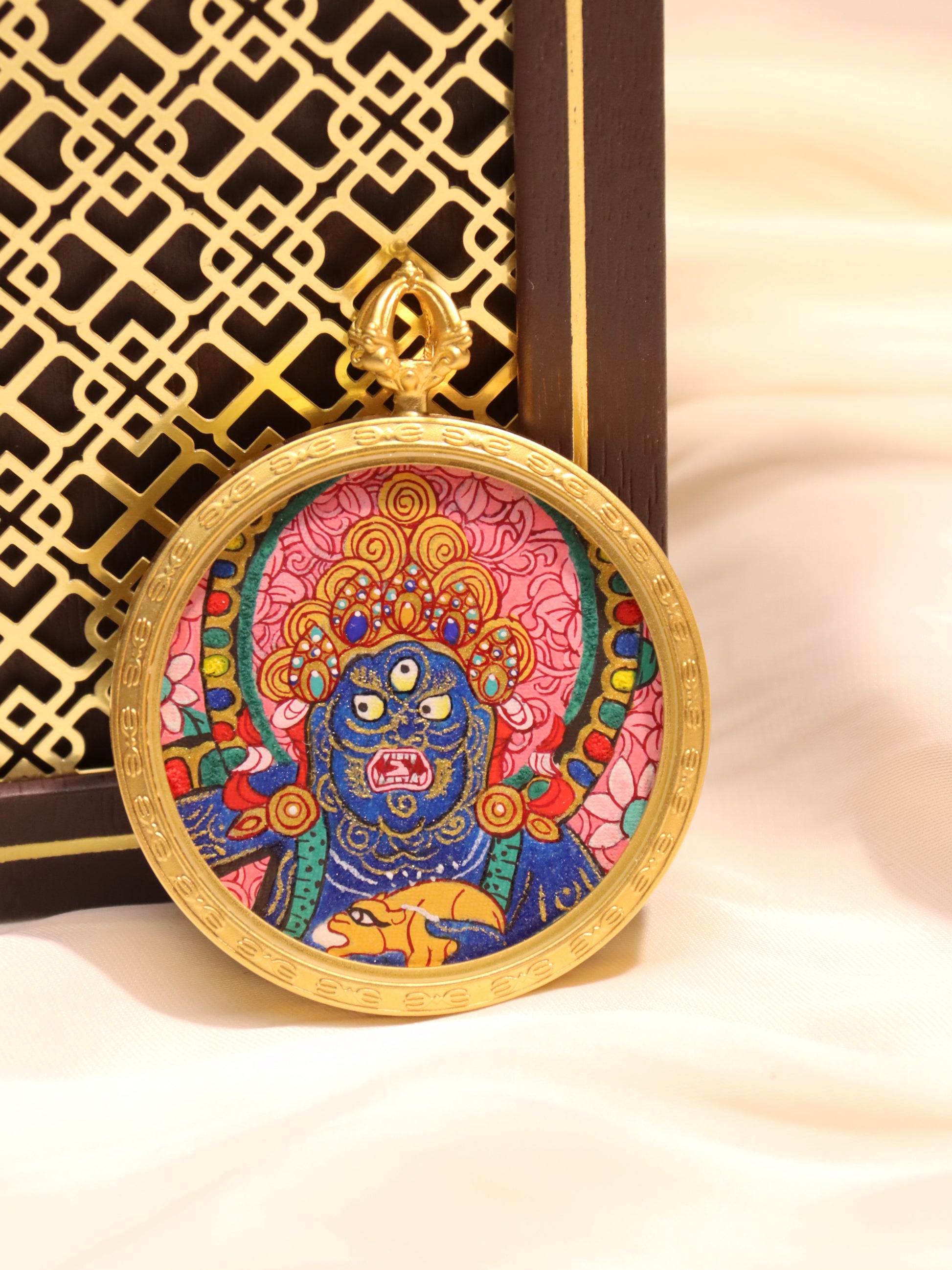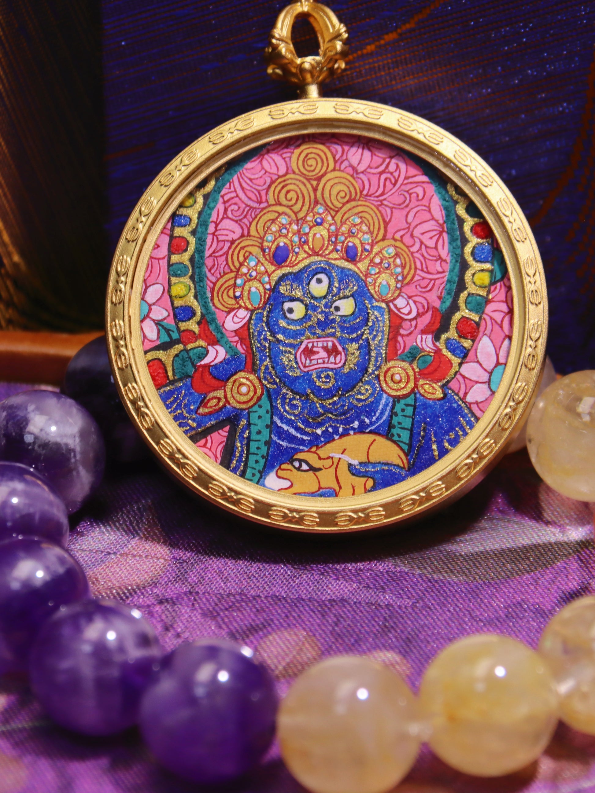 Every Thangka is hand-painted over weeks or months using time-honored methods. The process is entirely manual — no machines, no printing, only patience and prayer. To care for your Thangka pendant, keep it away from moisture and direct sunlight, and gently wipe it with a dry cloth. You may also place it in a calm space or near incense to preserve its sacred energy.